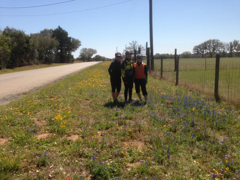 We saw lots of bluebonnets which are out, in spite of the drought, not as tall or heavy as some previous years but not quite as sparse as the last two years. Also pink and lavendar wild dianthus, yellow goat weed, red and burgundy wine cups, pale pink and white evening primrose and lots of orange indian paintbrush. The temperature was a nice mid 70's a low humidity, the wind was its usual 15-20 mph in your face and hills were challenging but all in all it was a great ride. Since I usually ride alone it was especially nice to have a couple of other people along including a male friend of Lens who seemed content to ride with us at our sedate pace.