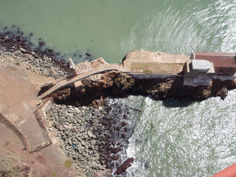 We rode past all of Fisherman's wharf and out along the water side to the Presidio on bike path. Then we hit a long but not horribly steep hill and a shorter steeper hill, both of which were highway but the traffic was light ( we rode on a Monday but I'm sure if had been a weekend it would have been crazy.) The two hills and a bit more of false flat and we were on the bike/walk path on the east side of the bridge. Things were a bit congestd right at the beginning of the bridge because of the pedestrian traffic but when it sorted it self out, it was easier to maintain a nice easy 3-5 mph and since we were on the East side, we had a full view of the city scenery. They trade to paths to alternate sides depending on the time and day. Since we hit the bridge at 10:30, the wind was fairly low and there was no rush hour traffic. The ride was smooth except for at the points where the spans came up through the bridge, then you had to do three short sides of a square and the was the possibility of someone coming in the opposite direction coming around the corner at you. Luckily there were only two of these.