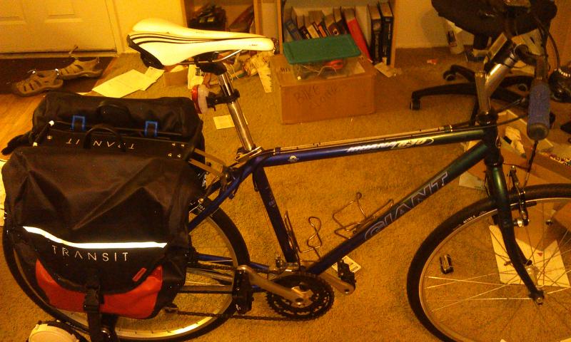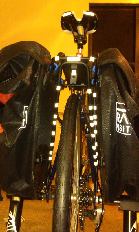 What you can't see well is the tape on the vertical support of the rack. I still have about a foot of the tape left. I'm still trying to decide what to do about extra rear and side visibility. I'm thinking of getting some silly reflective stickers to put on the rear triangle and cover up some paint defects while I'm at it. I also have a set of reflective stickers for spokes, so I'll be putting those on there at some point. Just needs a seat bag of some description for when I don't want to ride with the panniers.