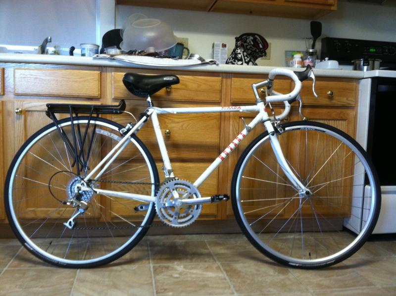 It all started when a co-worker convinced me to do the Dempsey Challenge, which is a big charity ride here in Maine to raise money for cancer research, next year. I decided to plan on the 50-mile ride as 25 miles would not be challenging enough and 100 might be a bit too much, and was thinking of just doing it on the rigid MTB I have set up as sort of an all-around bike with trekking bars and slick tires. Well, when I mentioned this to my co-worker (and another one who happened to overhear the conversation) I was strongly encouraged to see about picking up a road bike (bunch of enablers!). So I decided to keep an eye on Craigslist figuring it might take a while for something my size, decent quality and not expensive to come up. It didn't take long at all...there was a listing in Portland for an older Novara (REI brand) 48cm lugged steel road bike in good condition. I went to look at it and found out the guy selling it (had gotten it from a friend and it was too small for him) was the same one who took first place in the recent Cranksgiving ride which was kind of funny. The test ride was interesting b/c the bike had toe clips, which I have never used and found a little stressful trying to deal with in traffic--first thing I did after buying the bike was ditch those clips! The previous owner also had put an old 27" wheel on after the original front wheel was stolen, so I had to replace that (and got the seller to knock the price down because of it). Other than that easy-to-fix issue the bike is in nice shape. I haven't gotten to take a longer ride yet as it has been COLD here; today is supposed to be a little warmer but there is now a coating of snow on the roads...was hoping to ride today but that plan just went out the window because of the snow. Hopefully I will get a couple of rides in before winter really sets in, to see if I want to change anything (like the saddle or switching from downtube to bar-end shifters)--that way those things could be done during the winter. I know the white handlebar tape will eventually have to go--it looks nice when it's clean but won't stay that way for long!