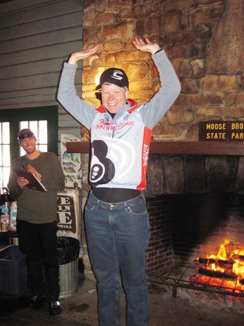One final time down the chute (where I chickened out after having crashed there previously!), and I was finished. Sixteen miles, 3:06, and a great sense of accomplishment! After the race, people gathered in the State Park building for hot chili, hot beverages, bread, cookies and other food, as well as a sweet raffle and the podium presentations. As if I weren't already tired from the effort, lifting the podium trophy took all the muscle I had left!